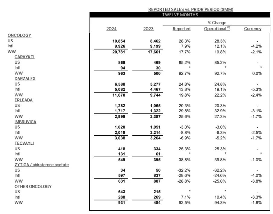 2024年强生肿瘤业务的增长主要归功于Darzalex(达雷妥尤单抗)、Erleada(阿帕他胺)、Carvykti(西达基奥仑赛)、Tecvayli(特立妥单抗)等产品强劲驱动。其中,靶向CD38的多发性骨髓瘤治疗药物Darzalex在全球所有地区的市场份额持续增长,全年收入达116.70亿美元,同比增长19.8%。这是该药自2015年上市以来,销售额首次突破100亿美元大关。