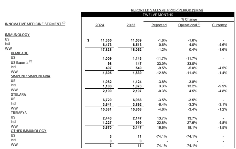 Tremfya(古塞奇尤单抗)则继续保持着两位数的增长,2024年的销售额达到了36.70亿美元(+16.6%)。