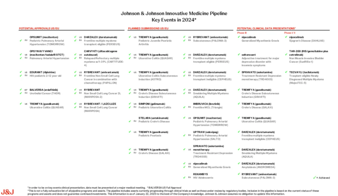 2024年,强生的创新制药产品管线在注册监管和重要临床研究数据读出方面也达成了多个关键的里程碑事件(详见下图)。