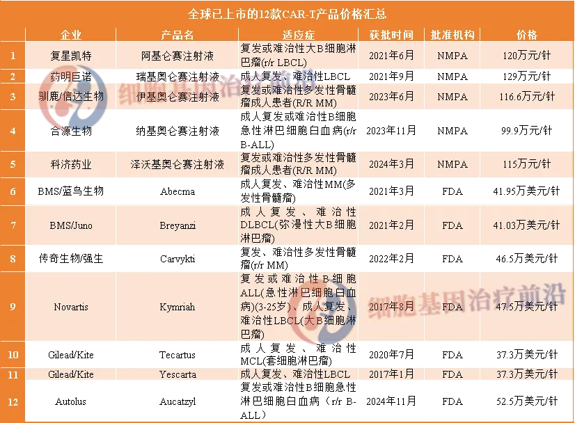 目前中美已经有12款CAR-T产品上市,价格均非常高昂。FDA最早于2017年批准首款CAR-T细胞产品Kymriah,也是第一个被批准用于2种不同适应症的CAR-T疗法,目前该药物在美国定价为Kymriah在美国定价为47.5万美元/针,这还不包括住院费和治疗副作用的药物。