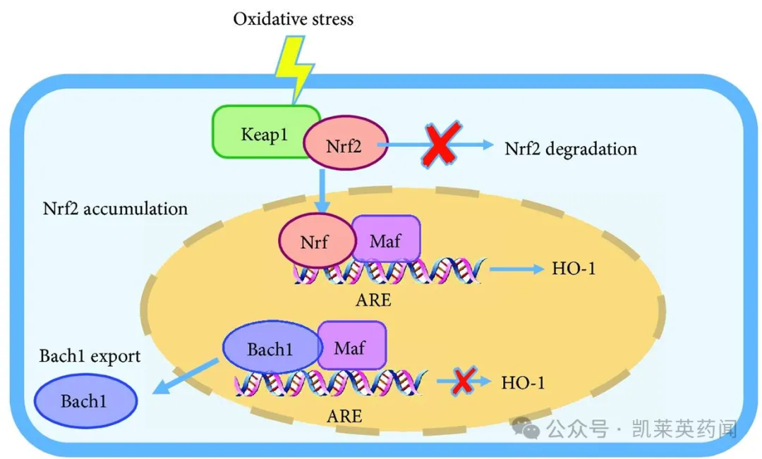 转录因子BTB-CNC同源体1(BACH1) 属于亮氨酸拉链(bZip)家族,在人体组织中广泛表达。转录因子BACH1具有与血红素结合的能力,因此在维持血红素对氧化应激的稳态反应方面是重要的;BACH1和核转录因子红系2相关因子2(NRF2) 竞争与氧化应激反应基因中的抗氧化反应元件(MARE)结合,在氧化应激期间,NRF2 与KEAP1 解离,转位到细胞核中,并以具有小Mafs的异二聚体的形式与MAREs 结合,从而激活氧化应激反应基因(例如HO-1 和NQO1),而BACH1 从MAREs 中置换并从细胞核易位到细胞质,发挥其作用。