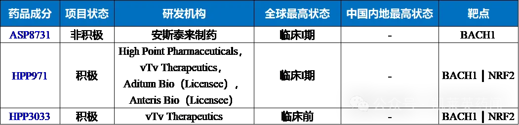 据不完全统计,目前全球在研的BACH1药物寥寥,研发最为靠前的是安斯泰来的ASP-8731,通过抑制 BACH1、增加抗氧化剂和 HbF
