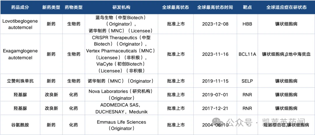 据不完全统计,全球已获批上市的镰状细胞病治疗药物共有6款,其中两款基因疗法于2023年底获批。
