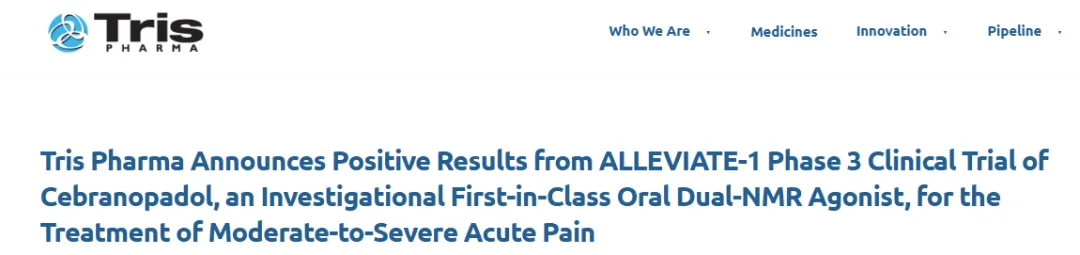1 月 22 日,Tris Pharma 宣布其用于治疗急性疼痛的首创口服双 NMR 激动剂 Cebranopadol 的关键性 III 期临床试验 ALLEVIATE-1 取得积极结果。