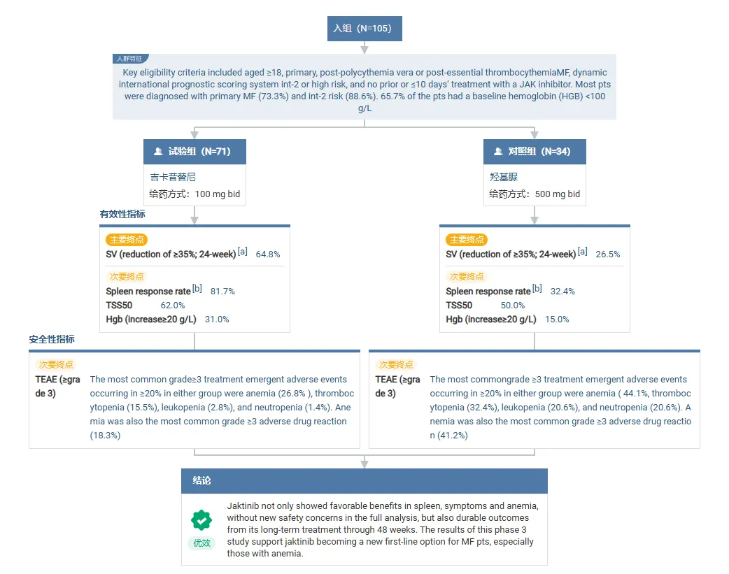 2022 年 10 月 17 日,泽璟制药的 JAK/ACVR1 双抑制剂吉卡昔替尼上市申请获受理,用于治疗中、高危骨髓纤维化,包括原发性骨髓纤维化(PMF)、真性红细胞增多症后骨髓纤维化(Post-PV-MF)和原发性血小板增多症后骨髓纤维化(Post-ET-MF),预计将于 2025 年 Q2 获批。该上市申请基于一项关键 Ⅲ 期临床试验 ZGJAK016 ,结果表明吉卡昔替尼不仅在脾脏、症状和贫血方面表现出良好的获益,而且从 48 周的长期治疗中也可以看到持久的效果。
