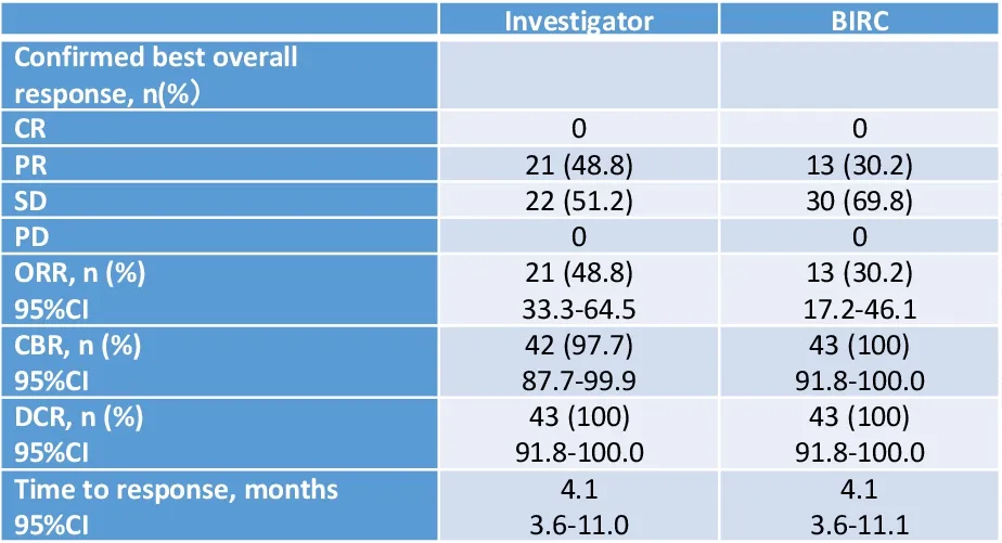 CLL 患者的 ORR 为 73.3%(33/45),CR/CRi 率为 24.4%(11/45),且 CR/CRi 率随剂量增加呈上升趋势。
