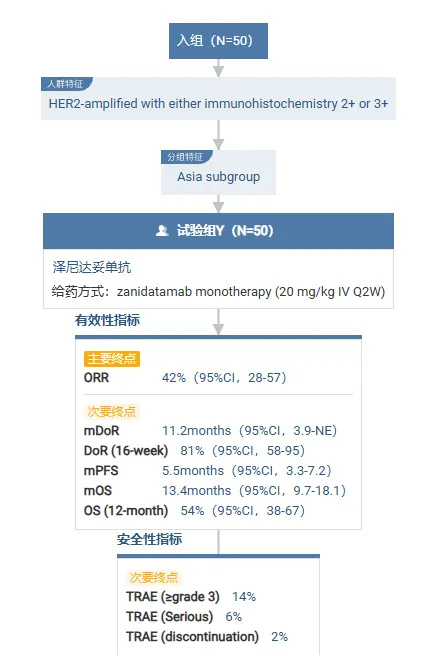 2024 年 6 月 7 日,百济神州的 HER2 双抗泽尼达妥单抗上市申请获受理,用于既往接受过全身治疗的 HER2 高表达的不可切除局部晚期或转移性胆道癌患者。该申请已被纳入优先审评,预计 2025 年 Q2 获批。泽尼达妥单抗的权益是几经周转。该药最初由 Zymeworks 开发。早在 2018 年,百济神州就通过一项 4.3 亿美元的合作,获得了它和另一款双抗 ADC 在亚洲(日本除外)、澳大利亚和新西兰的独家权益。22 年 10 月,Jazz 又与 Zymewarks 达成一项高达 17.6 亿美元的合作,获得了它在美国、欧洲、加拿大、日本等地区的权益。2024 年 11 月,泽尼达妥单抗获得美国 FDA 加速批准上市,用于治疗经治、不可切除、局部晚期或转移性 HER2 阳性胆道癌患者。Insight 数据库显示,这是全球首个获批用于 HER2+ 胆道癌的 HER2 双抗。泽尼达妥单抗在美国的获批是基于临床 Ⅱb 期试验 HERIZON-BTC-01 的数据。2024 年 12 月公布的 HERIZON-BTC-01 研究亚洲亚组总生存期和长期随访结果显示:患者的 ORR 为 42%,mDoR 为 11.2 个月,mPFS 为 5.5 个月,mOS 为 13.4 个月。