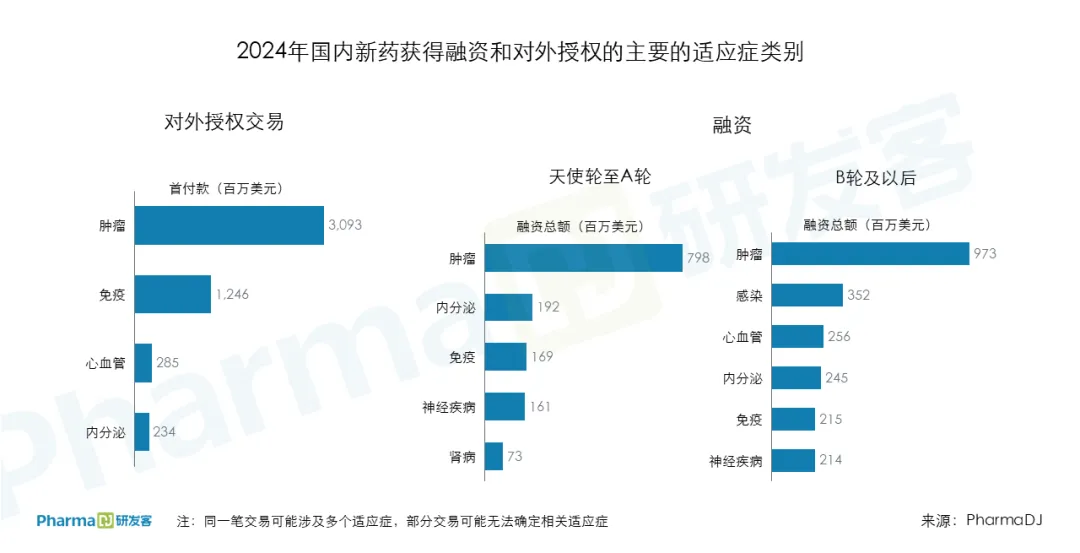 从国内来看,不论是对外授权还是融资,肿瘤都是获得资金最多的适应症。虽然获得后期融资的适应症相对分散,但从早期融资的趋势来看,与国际一致,肿瘤、以减重为代表的内分泌、免疫和神经学将是未来有望获得最多研发资金的四大适应症。