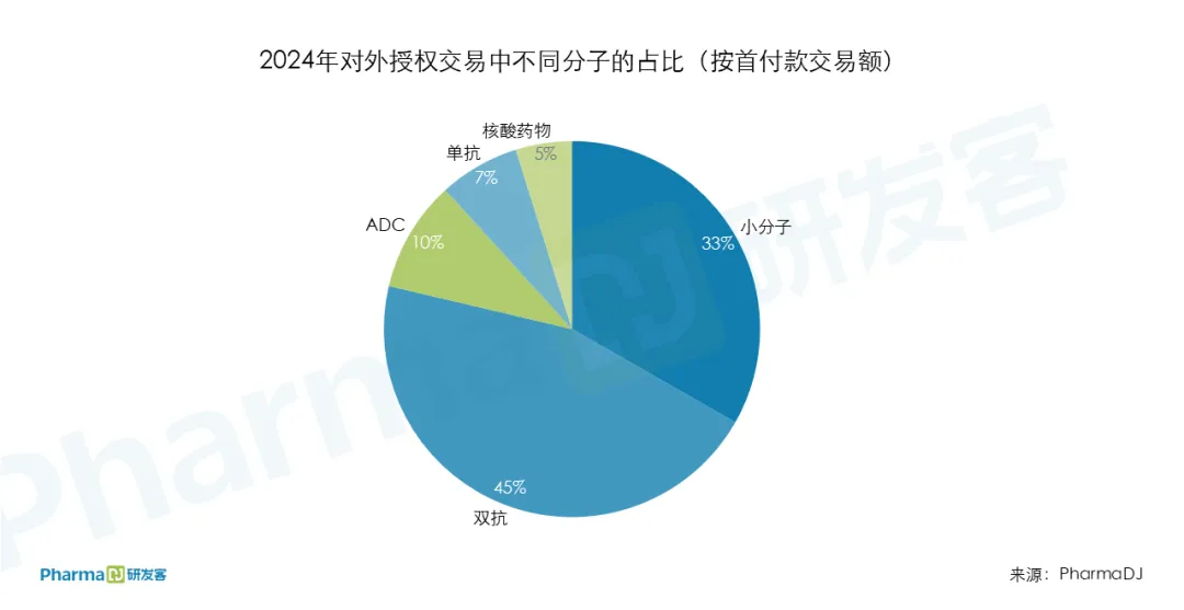 从达成对外授权的首付款来看,双抗和小分子是最重要的两类分子。去年,中国创新药企共达成14笔涉及双抗的对外授权,获得首付款共计18亿美元,其中3笔双抗交易首付款超过了1亿美元。