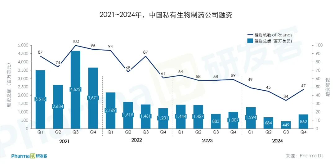 2024年,中国生物制药企业达成了175笔融资,公布的融资总额为32.9亿美元,相对于2023年和2022年分别下降了31%和59%。