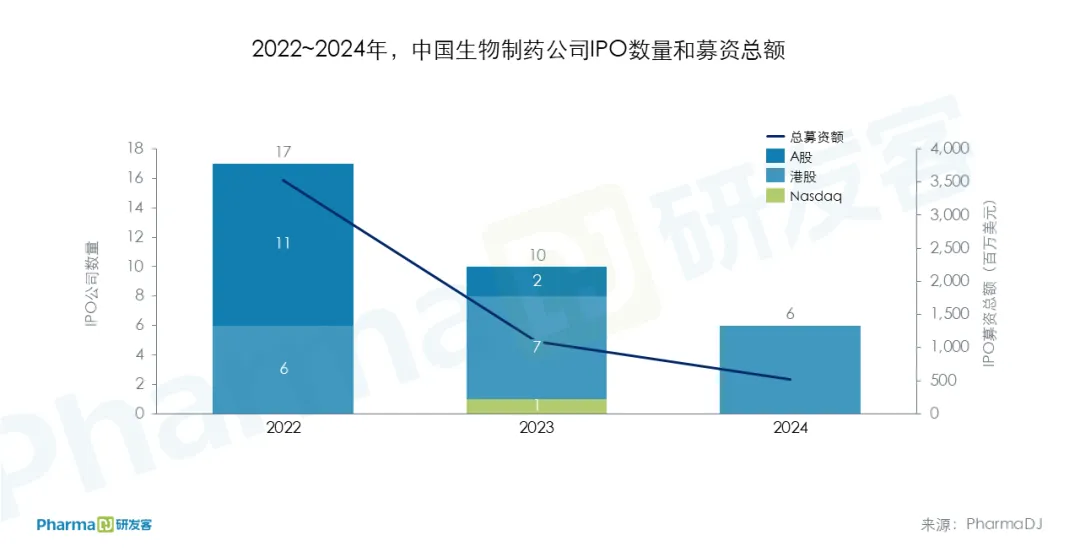 国内生物制药企业IPO在2022年达到近年来的高点后,2023年迅速回落,而过去的2024年,仅有六家生物技术公司在港股上市,且融资总额仅为约3.5亿美元。另有两家公司——依生和创响,分别通过de-SPAC和反向收购的方式在纳斯达克上市。