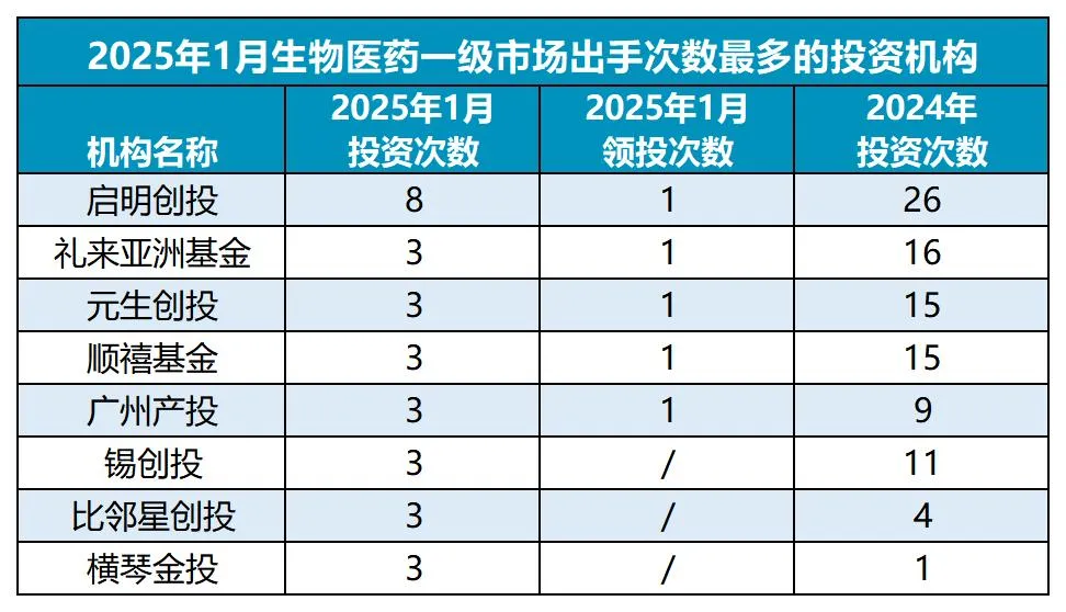 其中,启明创投、元生创投、礼来亚洲基金、比邻星创投、广州产投、锡创投、顺禧基金、横琴金投8家投资机构出手3次及以上。