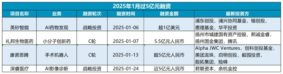 据医药魔方InvestGo数据库,2025年1月,国内生物医药行业一级市场披露了4起超5亿元融资,其中,英矽智能的超1亿元美元战略投资,小分子药物研发公司礼邦生物医药的5.5亿元C轮融资,以及AI影像诊断公司深睿医疗的近5亿元战略投资,都有政府/国资背景机构的参与。
