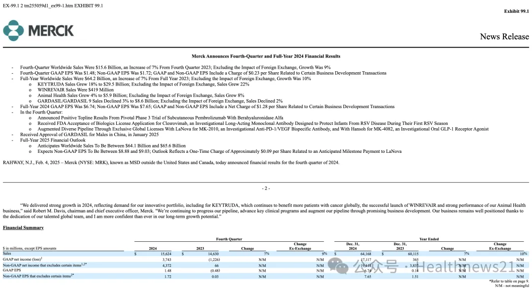 2月4日,默沙东公布2024年业绩,总营收641.68亿美元,同比增长7%。默沙东制药业务收入574.00亿美元,同比增长7%。其中,中国地区收入同比下滑20%至53.94亿美元,占据默沙东全球制药业务9.4%的份额。此外,研发投入为179.38亿美元,同比下降41%。