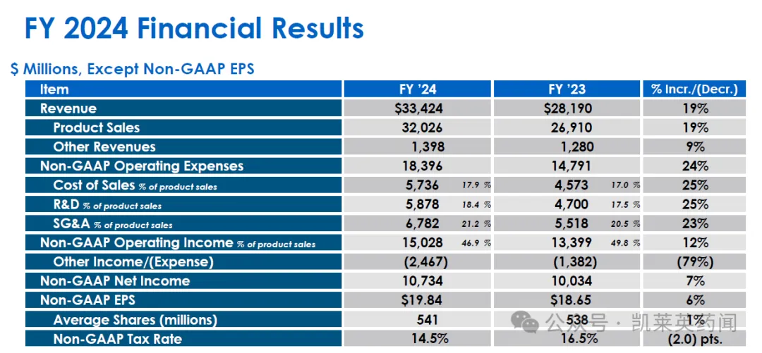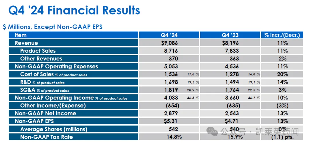 2025年2月4日,安进公布了2024 年全年和第四季度财务业绩。全年总收入334 亿美元,同比增长19%;其中Q4总收入91 亿美元,同比增长11%。