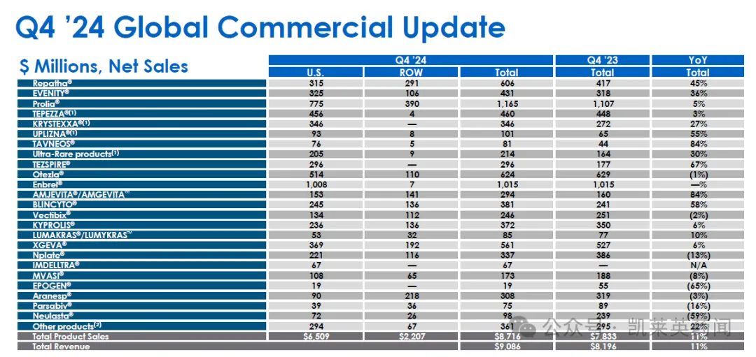 3、Prolia® (denosumab,地舒单抗):是一种RANKL抑制剂,用于防治骨质疏松症。2024全年销售额43.74亿美元,同比增长 8%;Q4销量12 亿美元,同比增长 5% 。