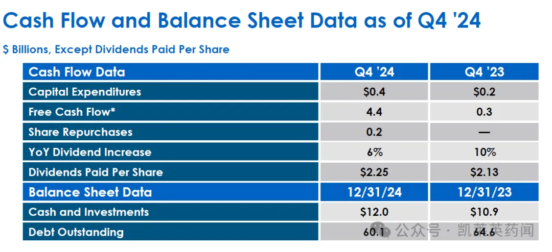 2024 年全年,公司创造了 104 亿美元的自由现金流,而 2023 年为 74 亿美元。