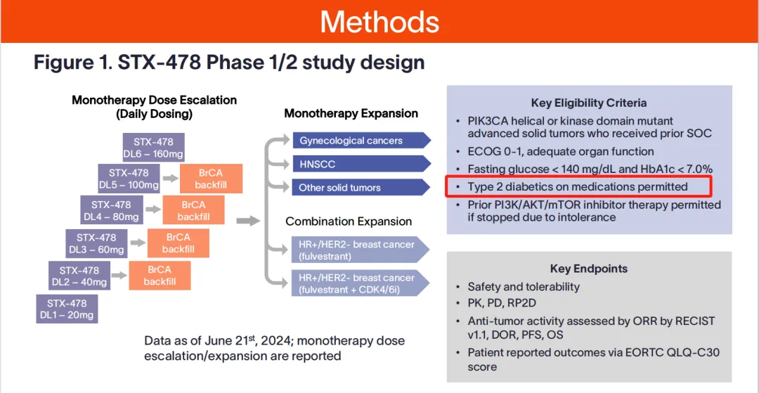 从入组患者标准上,我们看到STX-478的临床允许正在使用药物治疗的2型糖尿病患者入组,其次STX-478选择“单枪匹马”来验证自己在经过标准治疗且部分曾接受PI3K/AKT/mTOR抑制剂治疗而不耐受的实体瘤患者上的疗效,显然是大胆的。