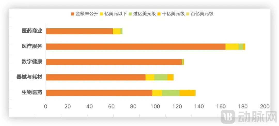 2024年全球医疗健康领域并购资金额规模分布,数据来源动脉橙产业智库