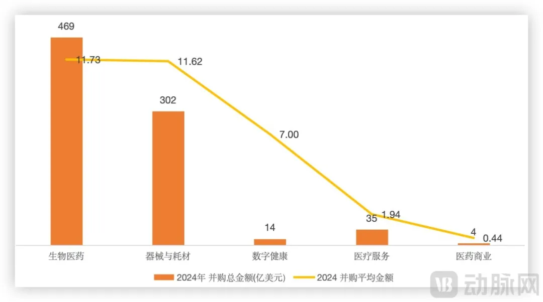 2024年医疗细分领域并购金额与平均交易金额,数据来源动脉橙产业智库