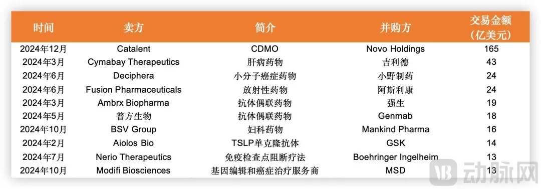 2024年全球生物制药领域并购金额TOP 10,数据来源动脉橙产业智库