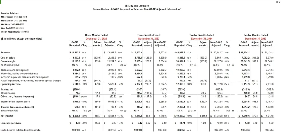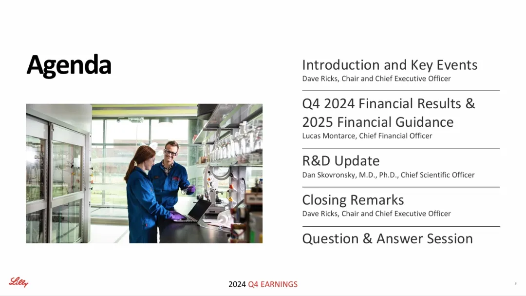 在昨日晚间的投资者电话会议上,礼来公布2024年4季度财报,涵盖财务业绩、各产品表现、业务进展、及未来指引等内容。