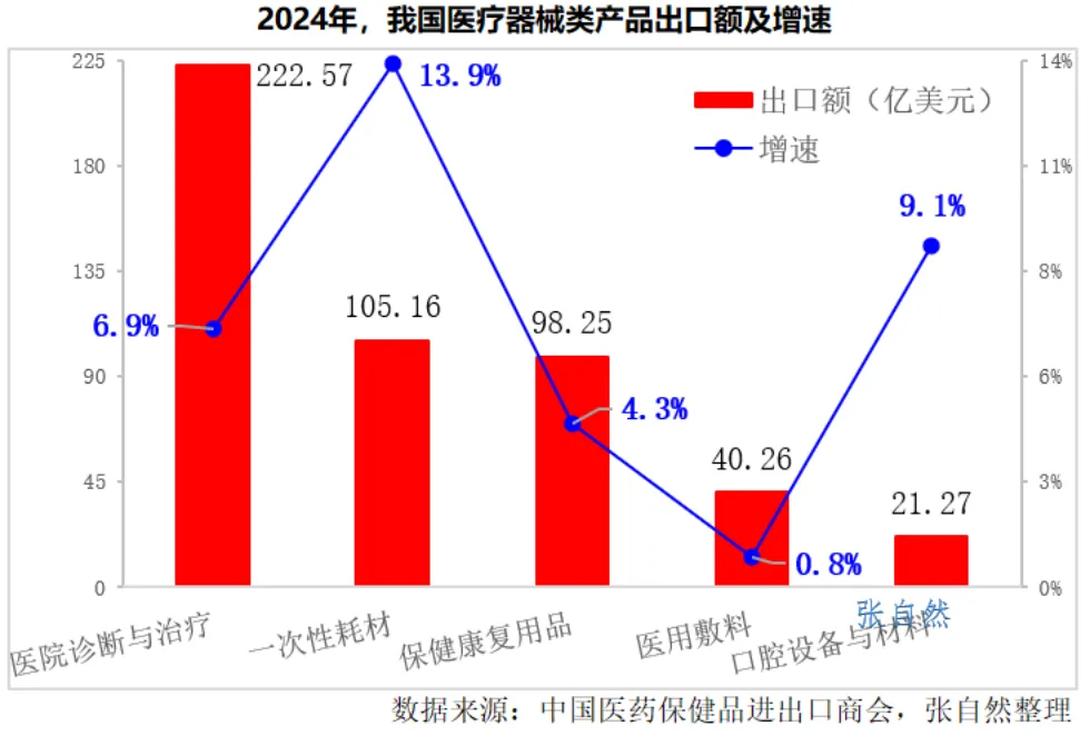 在5个子类医疗器械中,出口额较上年同比增长最快的是一次性耗材、口腔设备与材料,分别增长13.9%、9.1%,其次是医院诊断与治疗、保健康复用品,分别增长了6.9%、4.3%。增长最慢的是医用辅料,微增0.8%。(详见下图)