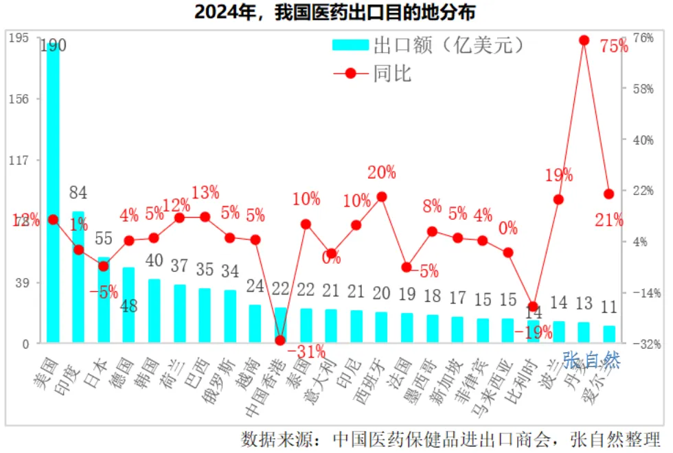 在2024年1079.64亿美元的医药产品出口中,出口到美国的仍最多,出口近200亿美元(190.47亿美元),比第2~4名的总和(186.21亿美元)还多,占了我国医药出口总额的17.6%;