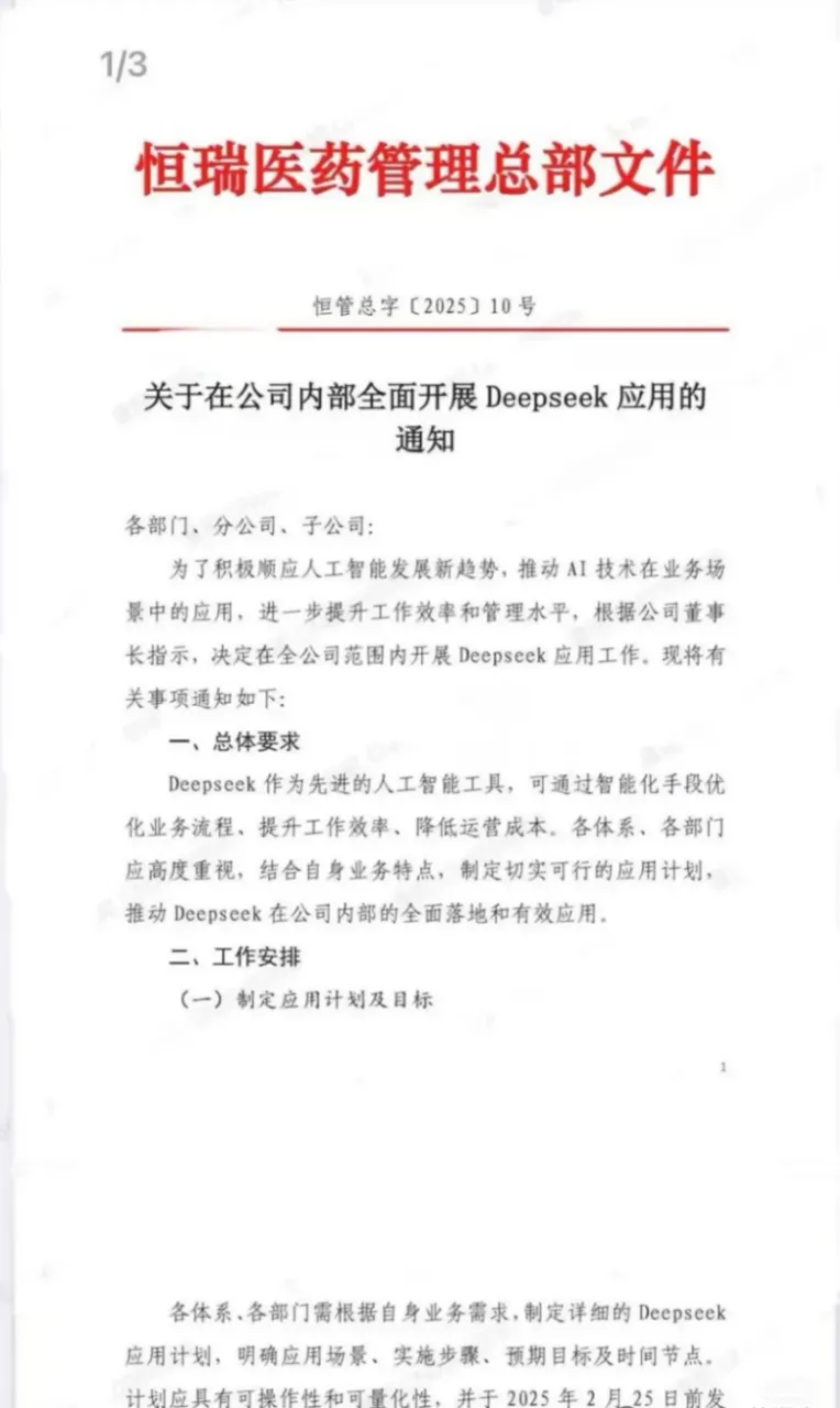 恒瑞医药开始行动了,春节假期结束便公布了红头文件,《关于在公司内部全面开展DeepSeek应用的通知》,由董事长孙飘扬亲自签发指令: