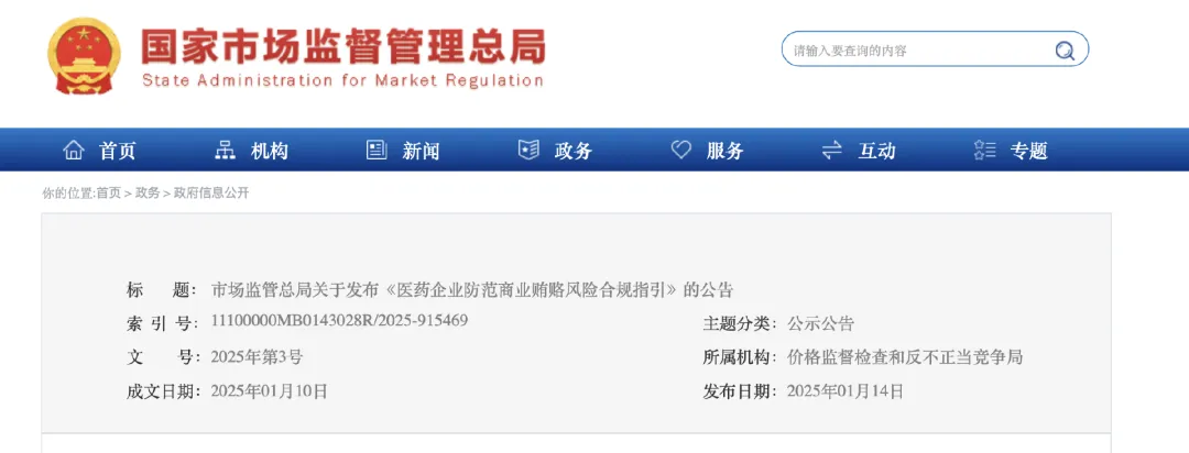 国家市场监管总局发布《医药企业防范商业贿赂风险合规指引》,督促药企切实履行合规责任。