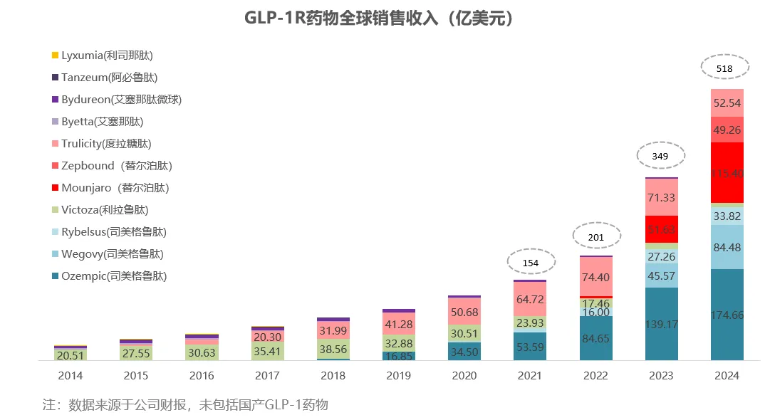 从2022年起,GLP-1药物就开始显露出爆发潜能,当年市场规模迈过200亿美元门槛,接着2023年又创收近350亿美元,如今更是一举突破500亿美元,三年实现三级跳,2025年朝着600亿美元进击。