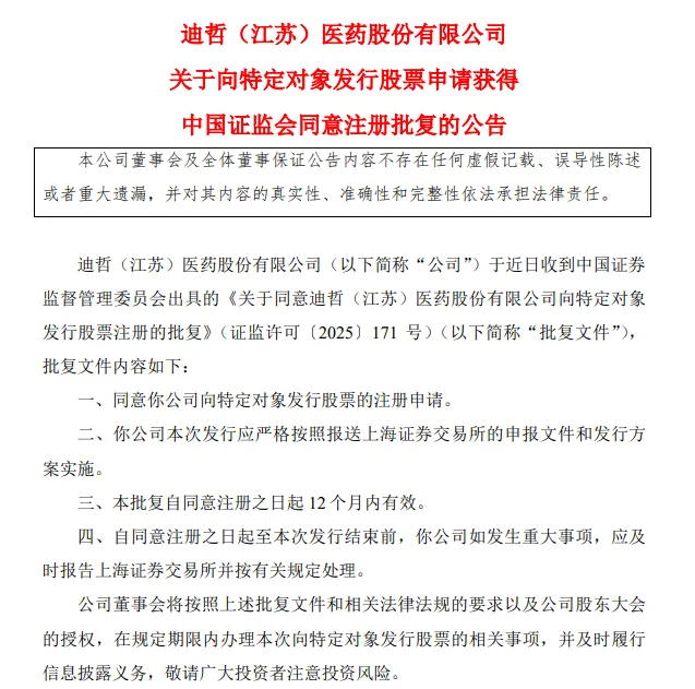 2月8日,迪哲医药发布公告,向特定对象发行股票的注册申请获证监会同意。此次募资超18亿元,主要用于新药研发和国际标准创新药产业化项目。