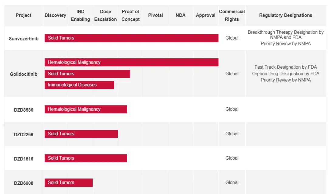 舒沃替尼是肺癌领域首个获中美双 “突破性疗法认定” 的国产创新药,用于二线及后线治疗 EGFR Exon20ins NSCLC,上市 7 个月实现近 2 亿元销售额,登顶罕见靶点新药销售纪录 。DZD8586、DZD6008 等产品处于国际多中心临床研究阶段,还储备了多个处于临床前研究阶段的候选创新药物。
