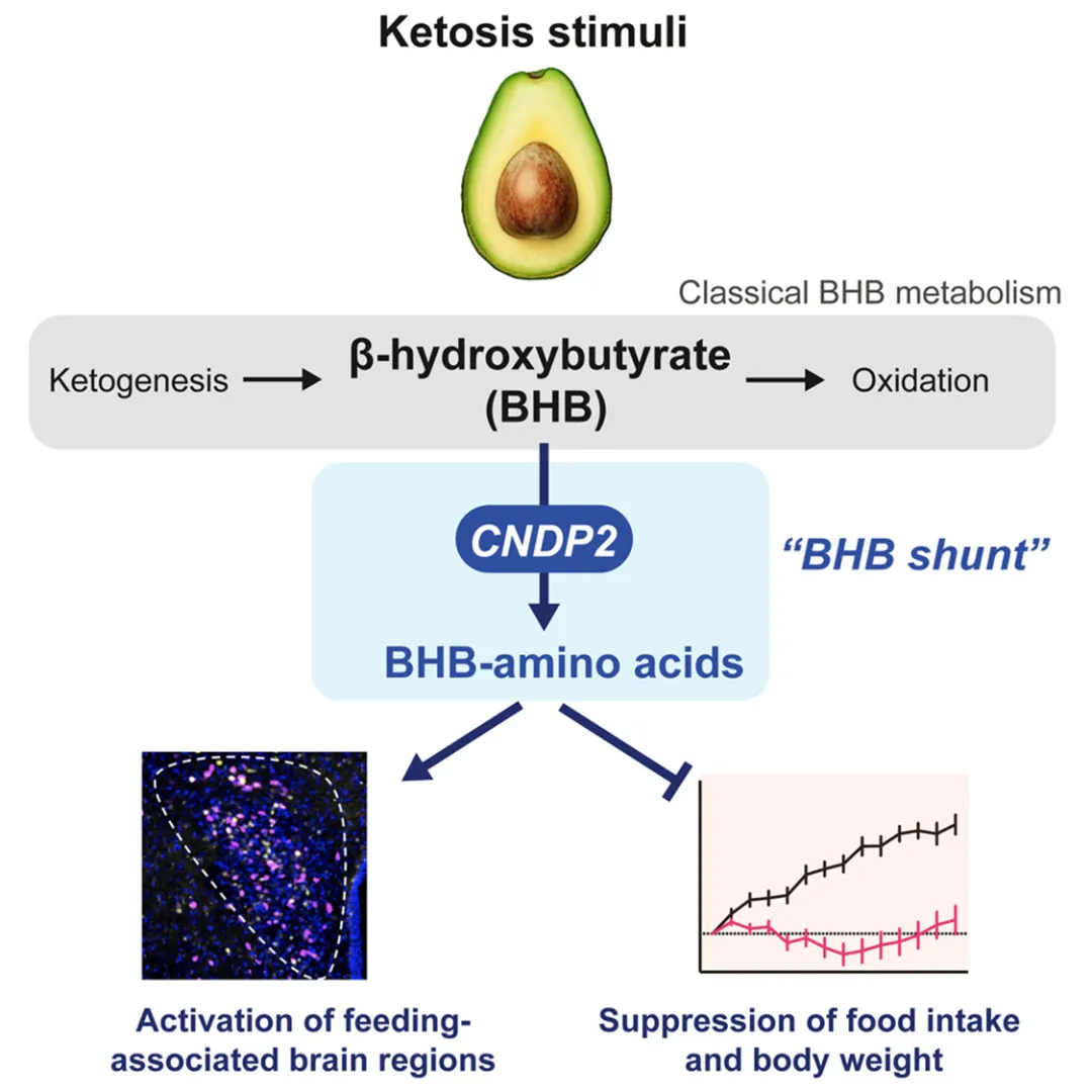 发现:β-羟基丁酸(BHB)是一种常见酮体。迄今为止,所有已知的BHB代谢途径均涉及BHB与主要能量中间体的相互转化。但在这项研究里,作者发现了一条此前未被描述的BHB次级代谢途径:通过CNDP2介导的酶促反应,将BHB与游离氨基酸结合。该BHB旁路代谢途径生成一类抗肥胖的酮代谢物——BHB-氨基酸。在小鼠中敲除CNDP2基因可消除组织氨基酸受BHB修饰,降低BHB-氨基酸水平。BHB-氨基酸中最丰富的是BHB-Phe,它能激活下丘脑和脑干神经元并抑制食欲。敲除CNDP2的小鼠在外源性酮酯补充或生酮饮食后表现出食物摄入量增加和体重上升。此外,CNDP2依赖性的氨基酸BHB修饰及BHB-氨基酸代谢物也保守存在于人体中。总之,CNDP2介导的酶促氨基酸BHB修饰是一条全新的酮旁路代谢途径,参与调节能量代谢平衡。