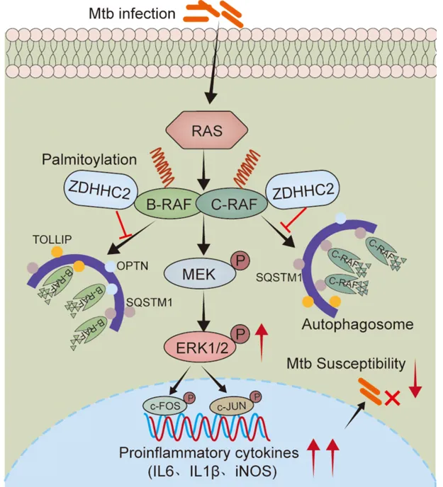 发现:S-棕榈酰化是饱和脂肪酸棕榈酸与蛋白质半胱氨酸残基的共价连接,属于一种可逆的翻译后修饰。它参与调控巨噬细胞的多种生理功能。然而,棕榈酰化在结核分枝杆菌(Mycobacterium tuberculosis)感染巨噬细胞过程中的具体作用及其潜在机制仍不清楚。本研究发现,结核菌感染可诱导小鼠巨噬细胞中锌指DHHC结构域型棕榈酰转移酶(ZDHHC)的表达,其中ZDHHC2尤为显著。而小鼠巨噬细胞中ZDHHC2的缺失会削弱其对结核菌的免疫防御能力,降低多种促炎细胞因子的产生。在机理上,ZDHHC2介导B-RAF和C-RAF的棕榈酰化,影响它们自噬降解,从而稳定其蛋白水平。B-RAF和C-RAF的增加则增强了ERK信号通路的活性,从而影响结核菌在巨噬细胞内的存活。本研究揭示了ZDHHC2在结核感染中的关键作用,并阐述了它作为潜在结核病治疗靶点的可能性。