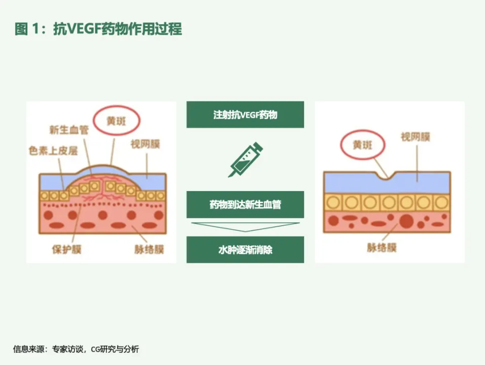 根据综述《眼部抗VEGF药物缓释系统研究进展》,视网膜色素上皮细胞、血管内皮细胞等均可产生血管内皮生长因子(即VEGF),VEGF的作用主要是增加现有血管的通透性和促进新生血管生成,过量表达的VEGF促使脂质和蛋白质等大分子从血管逃逸到视网膜,形成血管周围组织水肿,发生糖尿病性黄斑水肿(diabetic macular edema,DME);另一方面,新生血管性年龄相关性黄斑变性(neovascular age-related macular degeneration,nAMD)中过量的VEGF促进脉络膜新生血管生成,新生血管向上生长突破Bruch膜和RPE导致出血和水肿,最终形成纤维瘢痕破坏黄斑中心的感光细胞。
