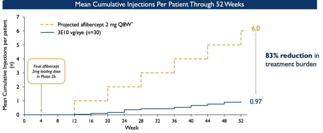 这里给出的也是这方面最关键的数据:与2mg Q8W剂量-频次下的 阿柏西普相比,3E10 vg/眼剂量下的(这里vg指的是病毒颗粒的单位,3E10指的是3的10次方)的注射负担减少了83%,70%的患者需要0-1次补充注射,57%的患者在52周内无需注射。如图所示,在整个试验组和阿柏西普对照组相比,之后累积注射次数方面,每位患者的注射次数为0.97次 VS 6次,减少了83%的注射负担。