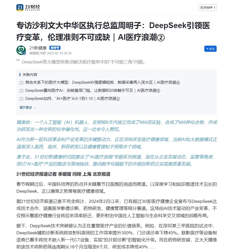 例如在医学影像分析中,DeepSeek能够精准识别肿瘤和病变,辅助医生进行全面的诊断,显著提高了诊断的准确性和效率。在个性化治疗方案制定方面,DeepSeek通过分析患者的基因信息和病史,为患者提供定制化的治疗建议,通过“精准医疗”,提升了治疗效果并减少了副作用。此外,在临床试验设计方面,DeepSeek也能为药企、医生带来更多临床建议,加速了新药研发的进程。这些成果不仅提高了医疗服务的质量和效率,还为医疗健康产业带来了创新的解决方案,推动了整个行业的数字化转型。
