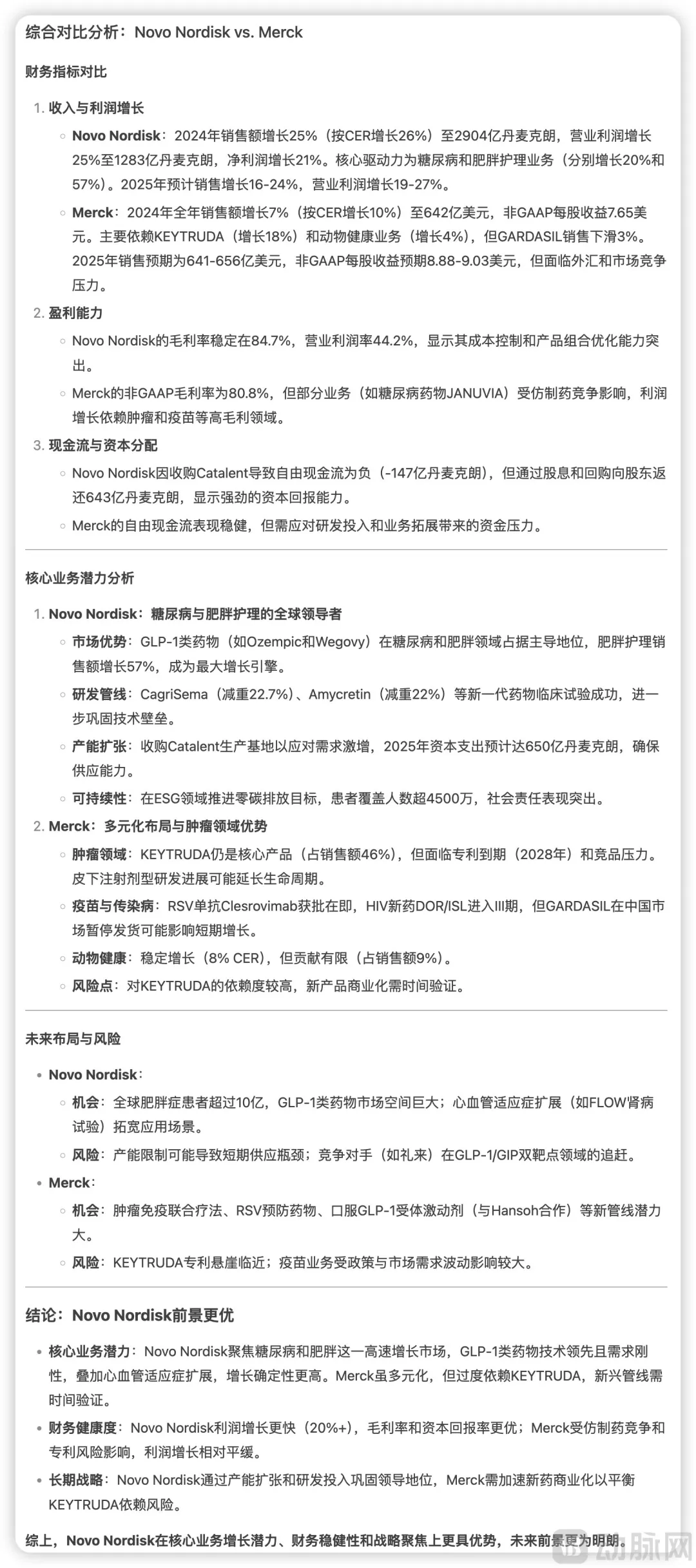 总的来说,在专利到期前,GLP-1赛道的竞争主要还是诺和诺德与礼来之间的竞争,正是在礼来的不追赶下,司美格鲁肽有极大机会在2025年登顶“药王”宝座。Deepseek在分析诺和诺德与默沙东的年报后,从经营指标、核心业务潜力以及未来布局与风险后,也得出了诺和诺德前景更优的结论。实际发展如何,让我们拭目以待。