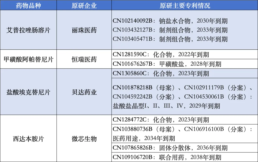 面对或早或晚到来的专利悬崖,类似于跨国药企通过构建“基础专利+次级专利”组合的方式,本土创新药企业们也在通过沿技术分支和产品开发时序进行布局,以累叠专利有效期,延长产品保护,拖延仿制药竞争对手进入的时间。