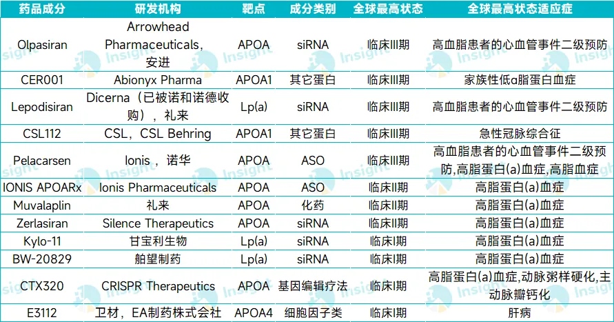 Lp(a)是心血管疾病的重要危险因素之一,然而全球尚无获批用于特异性降低 Lp(a) 水平的药物。不过根据 Insight 数据库,目前已有 10 多款靶向 Lp(a) 的药物进入到临床阶段,入局的玩家既有诺华、礼来、安进等跨国药企,也有多家国内的 Biotech 公司。