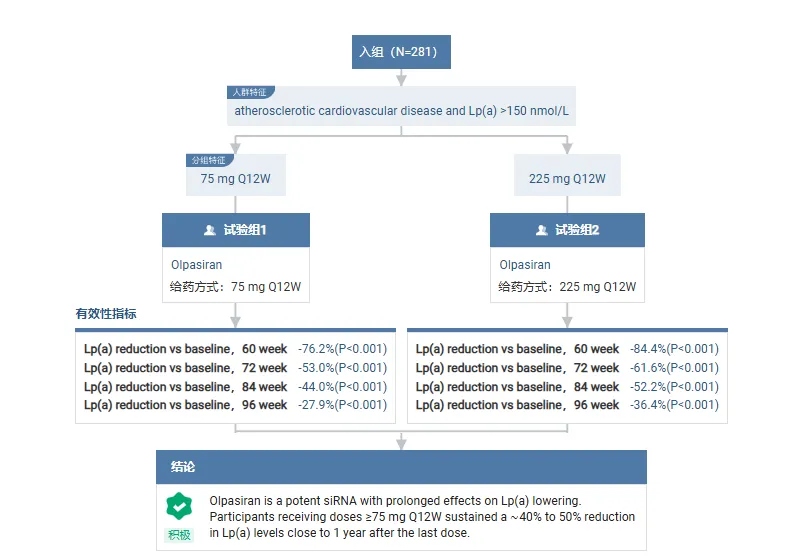 Ⅱ 期研究(NCT04270760)结果显示,每 12 周接受 75 mg 剂量 Olpasiran 的患者,在治疗 36 周时血液中 Lp(a) 水平下降为 97.4%。而且,Olpasiran 各剂量组患者的 LDL-C 和载脂蛋白 B 水平也显著降低。2024 年 8 月公布的最新研究数据表明,超过 75 mg 剂量的参与者在末次给药后近一年内,Lp(a) 水平仍显著降低约 40%~50%,Olpasiran 展现出持久的降脂能力。