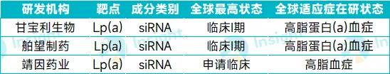 · Lepodisiran:Dicerna(已被诺和诺德收购)与礼来合作开发的一种靶向 Apo(a) 编码基因 LHA 的 siRNA 降脂药物,正在开展针对高血脂患者的心血管事件二级预防的 Ⅲ 期临床。