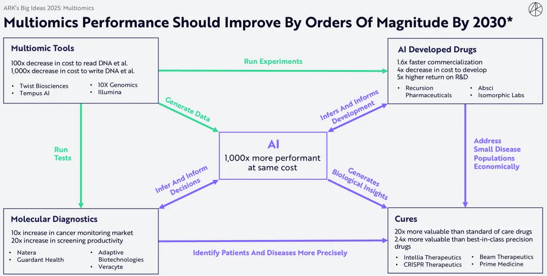 Ark Invest发布《Big Ideas 2025》报告,预测AI将彻底改变多组学工具、药物研发、分子诊断,并显著改善药物的经济回报