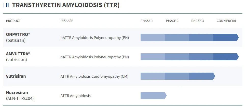 其中用于治疗转甲状腺素蛋白样变的siRNA药物ONPATTRO (patisiran) 和 AMVUTTRA (vutrisiran)2024销售额分别为2.53亿美元(-29%)和9.7亿美元(+74%),总计12.23亿美元。
