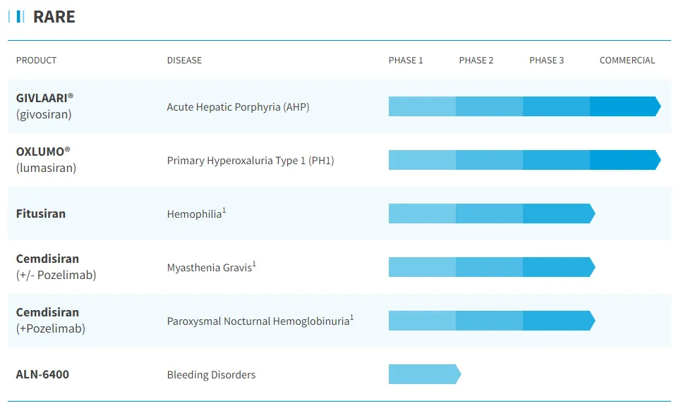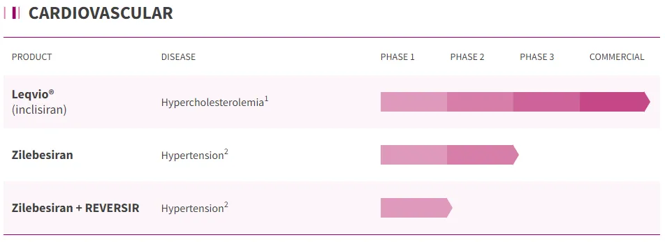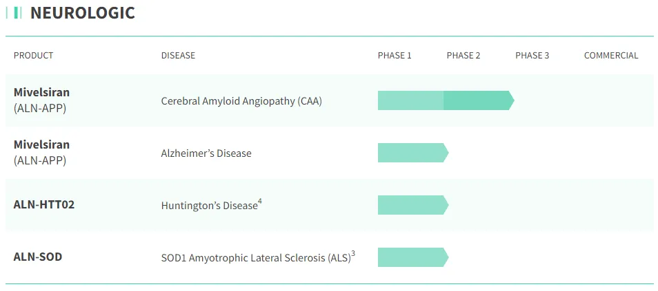 Alnylam于2002年成立,致力于通过 RNA 干扰(RNAi)技术开发创新药物,以治疗各种疾病。公司拥有多个治疗领域推进基于 RNAi 的创新药物深度管线,包括罕见病、心血管疾病、代谢疾病、神经系统疾病等。