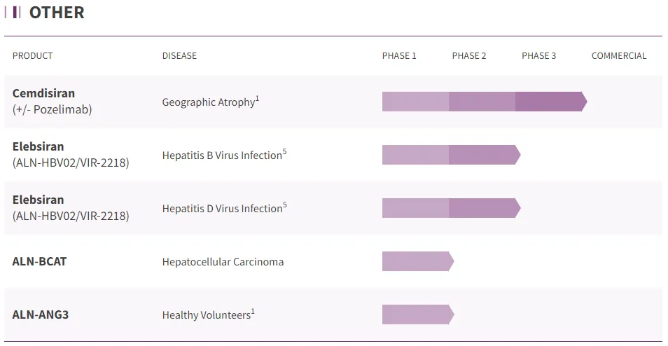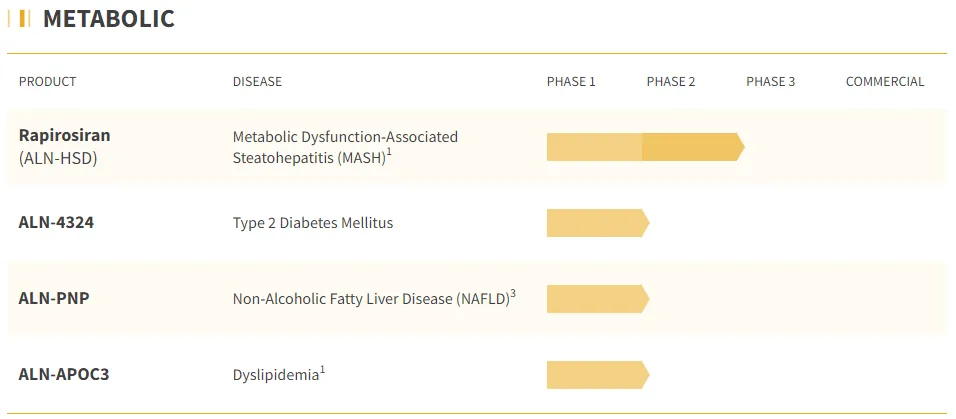 暂停了针对 2 型糖尿病的实验性 RNAi 疗法 Aln-KHK 的进一步临床开发,合理调整研发资源配置,聚焦更有潜力的项目。