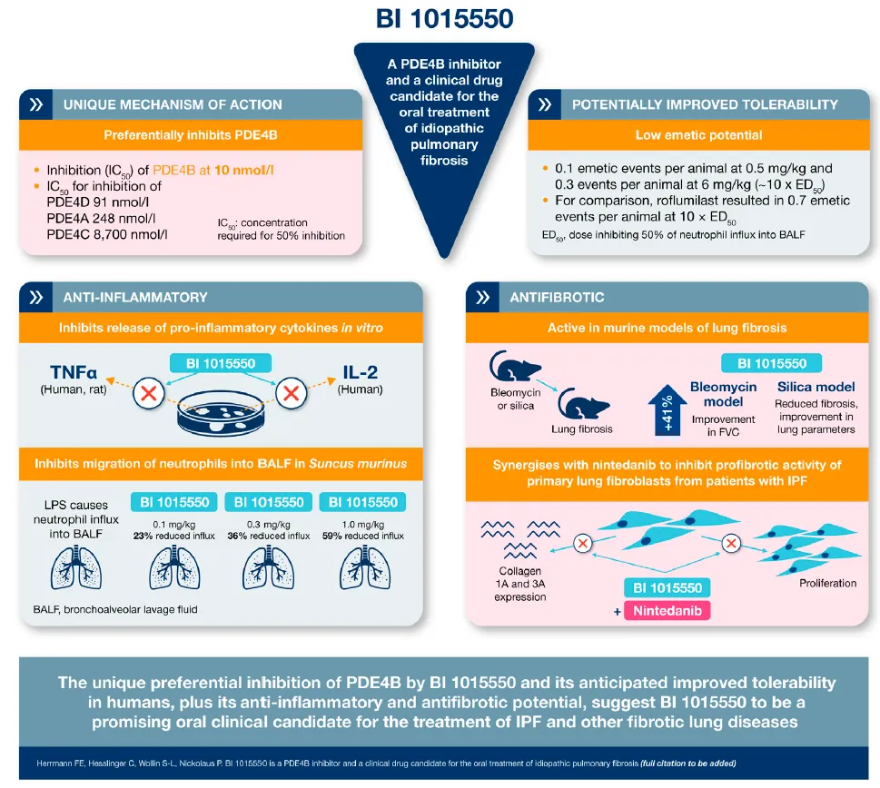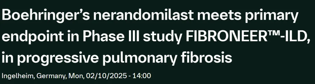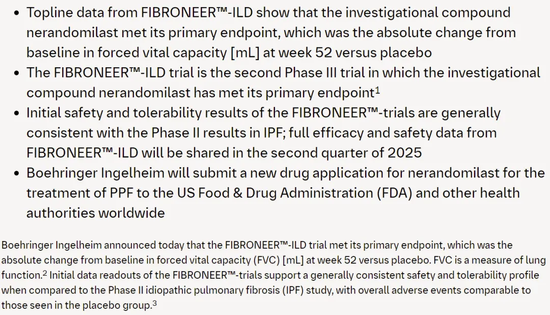 2025年2月10日,勃林格殷格翰宣布PDE4B抑制剂Nerandomilast治疗特发性肺纤维化的第二项三期临床FIBRONEER-ILD达到主要终点,将递交上市申请。去年9月,Nerandomilast第一项三期临床FIBRONEER-IPF获得成功。