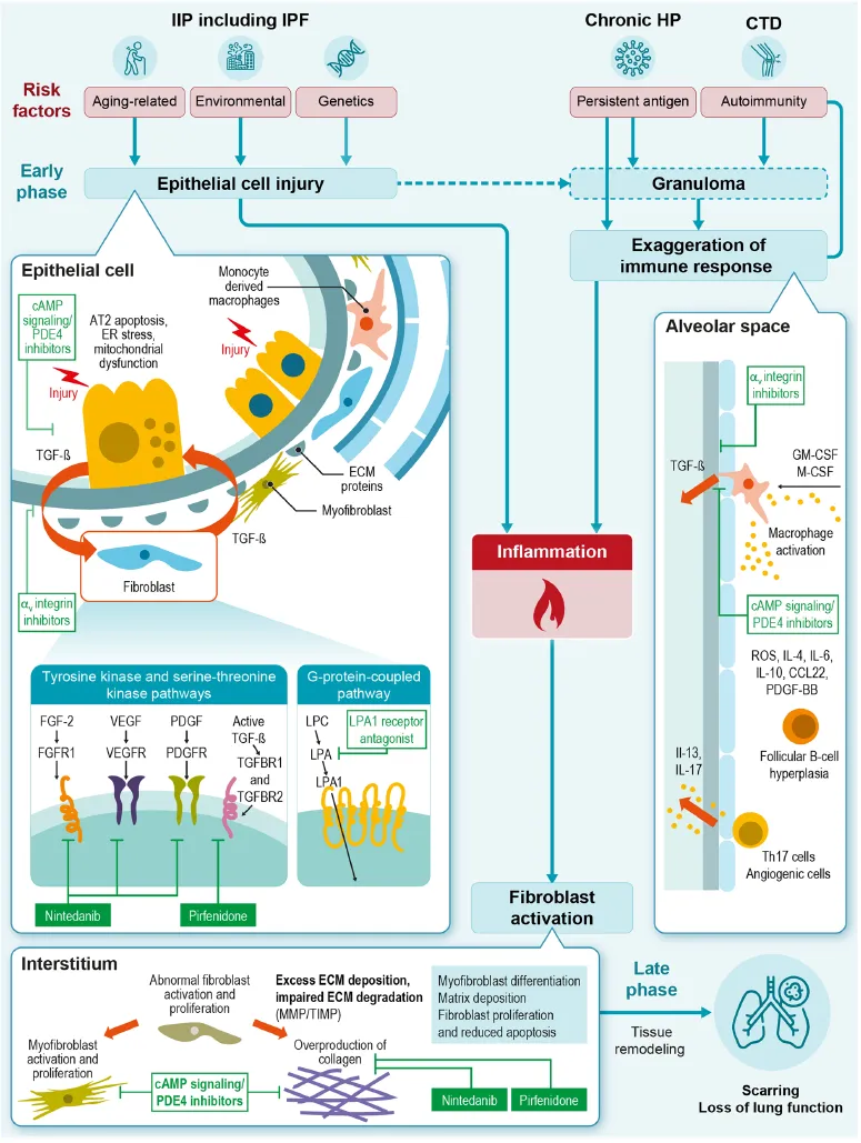 特发性肺纤维化(IPF)是一类最常见的进展性纤维化间质性肺疾病(ILD),其临床症状包括:活动诱发的呼吸急促、持续干咳、胸部不适、疲劳和乏力。IPF影响了全球约三百万人,主要影响50岁以上的人群,且男性患者多于女性。