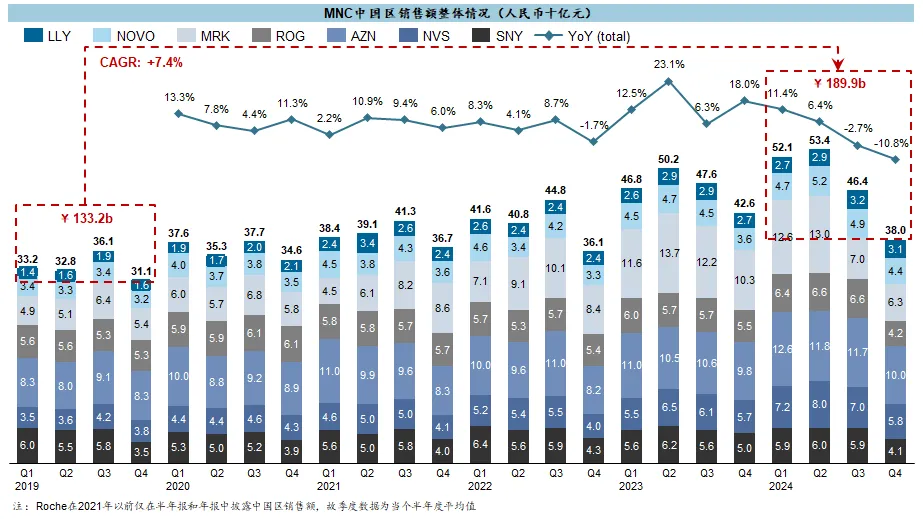 在排名靠前的MNC中有以下7家明确披露中国区收入,我们可以发现刨除疫情期间的波动影响,MNC整体在中国区的业绩此前基本都相当稳健、年化增速在8%左右;然而就在2024年下半年,突然出现同比大幅下滑,特别是四季度直接同比减少了10%以上,这在过去5年首度发生。需作说明的是,这还是用当期汇率换算的人民币金额,如果考虑到去年的人民币走弱,下半年的美元业绩金额可能会更难看。